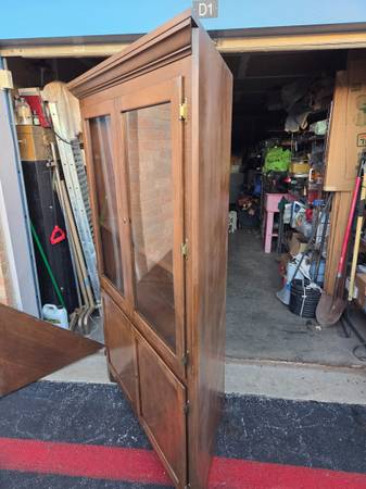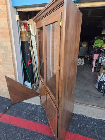 Large corner cabinet in light wood. Has two adjustable shelves on the top and storage on the bottom with one shelf. Top is open glass and bottom is enclosed with one shelf. Nice condition.