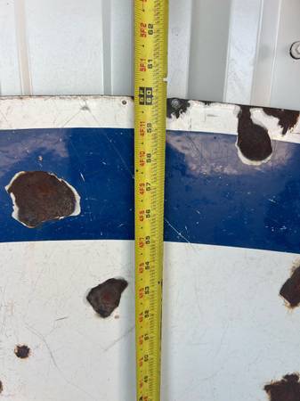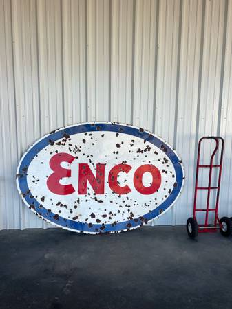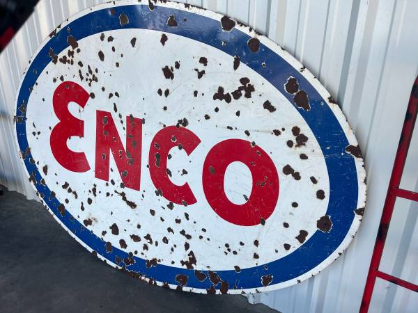 Large Enco single sided porcelain sign. It measures 7 foot 5 inches across. And is 5 foot tall. Colors still represent very well. Great Wall hanger. Perfect for a shop, man cave or restaurant. Asking $2000. Reasonable offers considered. Pick up at Lake Brownwood, Tx. I can help load. Call or text for more info. This is the only sign I have for sale at this time so please don’t ask. Thanks.