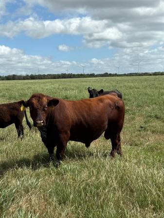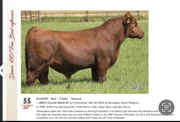 4 year old 3/8 Simmental Bull. Gentle and no problems, just changing directions. Really good producer! Makes outstanding heifers for keeping. Also sold some show steers out of him. No papers.