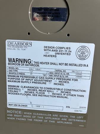 DEARBORN HEATERS MODEL DRS 18FT 16,000 BTU 2 HEATERS $125 EACH DEARBORN HEATER MODEL DRC 30MC 20,000 – 30,000 BTU $250 REEDY HEATER FORCED AIR 30,000 – 55,000 BTU $75 ALL ARE PROPANE READY