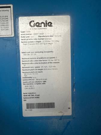 Selling a 2007 Genie S-65 4x4 telescopic boom lift.