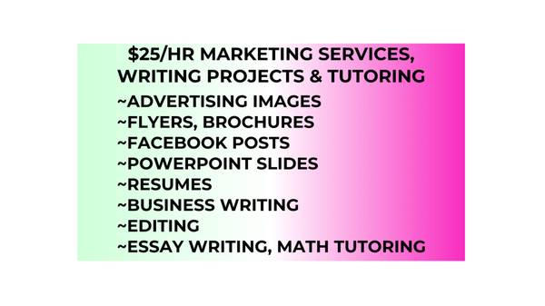 $25 an hour (Zoom) marketing services, writing projects and tutoring b