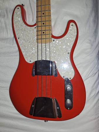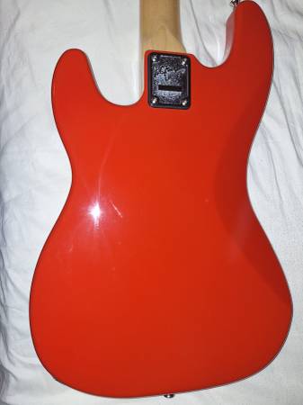 For sale: Harley Benton PB50 bass. This bass has upgrades and a headstock mod to look like a classic BC Rich. The Roswell single coil pickup is hot and sounds amazing with the new DR stainless steel strings. Classic chrome bridge and pickup covers have been added, a custom pickguard crafted in England is installed, the tuning machines were swapped out with top of the line Grovers and a Hipshot string tree was added to the headstock. The neckplate was changed for a BC Rich plate. The full size volume and tone pots are solid with no crackles. Control cavity is copper shielded also. An old school looking bass with a more modern vibe. Looks and plays great. No case.