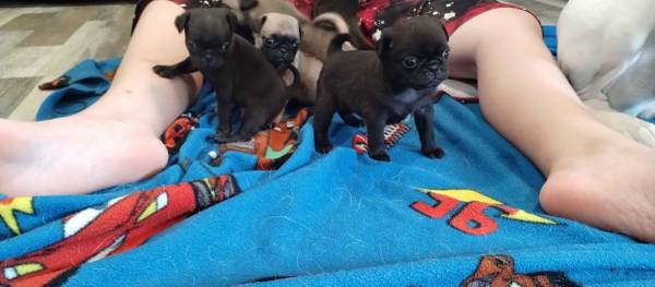 Two male pug puppies 8 weeks. Fawn and black. Have been vet checked shots and wormed. $400. 325-642- six four two three.