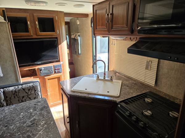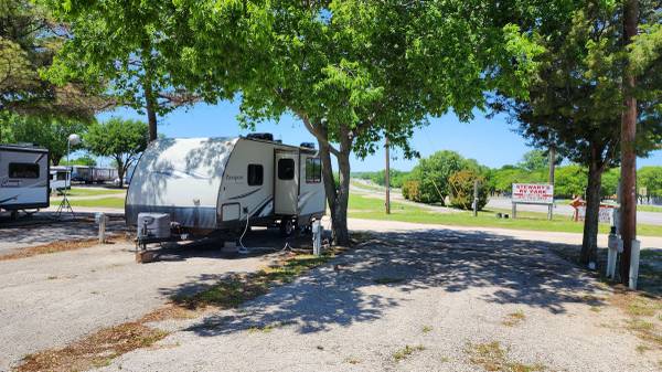 Camper front face has some "oil canning" effect that is purely cosmetic. I installed some eternabond tape along all roof/vent seams 2 years ago just as a precautionary measure. Installed new roof vent covers, replaced water pump and bathroom faucet at same time. Solid little trailer I just don't travel for work like that anymore. Comes with a few extras like a sway bar kit, mirror extensions, surge protector, 120AC adapter. All interior lights were replaced with white LEDs. The TV I installed in the bedroom will stay. Has an outdoor kitchen with counter/sink/cutting board/cabinet. Also includes OEM gas grill that attaches to swing out arm off the back bumper where there is a quick attachment for propane that ties to the tanks on the tongue. NO PROPANE TANKS INCLUDED. Awning has some wear but still provides shade and rain cover. Boards you see on the bed in photos were removed for accessing the slide motor that DOES NEED TO BE REPLACED. It's a sub $200 part. It will actually still pull the slide in with the button. But to get it out you must hold the button and have some friends push it out. Not a big deal if the intention is leaving it one place like a hunting lease. Everything works as expected except for this function. AC works great. I will include a window unit that slides right into the bedroom window slot when that window is removed. Pic included of the window unit installed. I used it this way in hotter areas and kept the roof AC from overworking itself and just overall cooler. I like it cold at night. Hot water heater heats just fine. CLEAR TEXAS TITLE. $9500 OBO