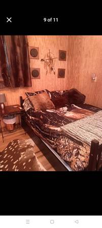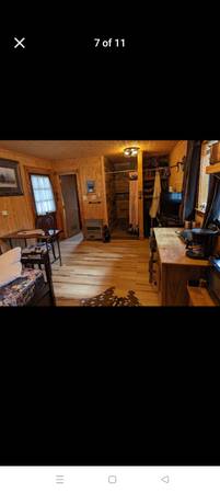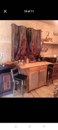Amenities: custom table with cowhide chairs, tv, internet giant walk-in shower with built in seat, queen bed with trundle, copper barrel sink and copper accents. 2 burners, with pot, pan, plates, bowls, cups, silverware, microwave, toaster oven, fridge, blackout curtains, digital entry and BBQ grill and fire pit. And your own private parking next to cabin. And for the ambiance Deer, elk, wild horses, raccoons....text me for pictures show contact info